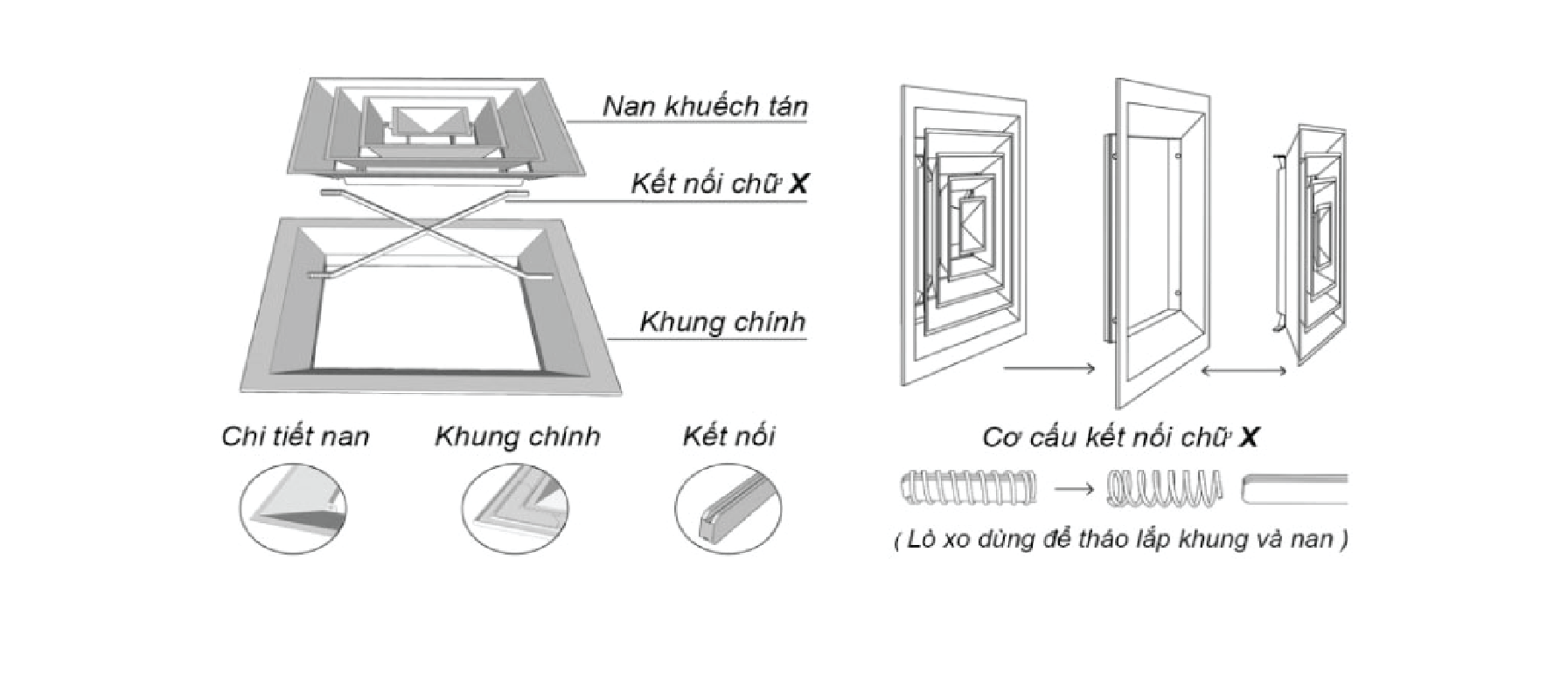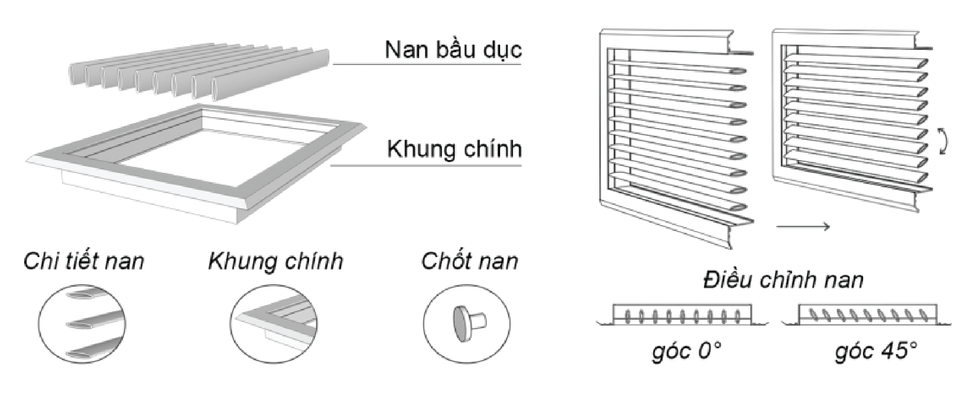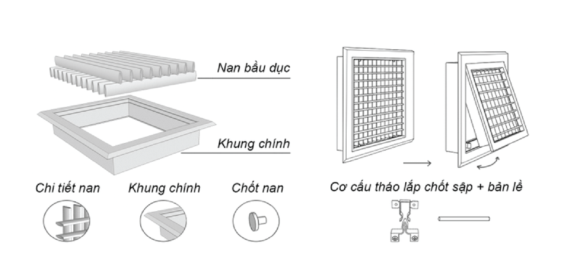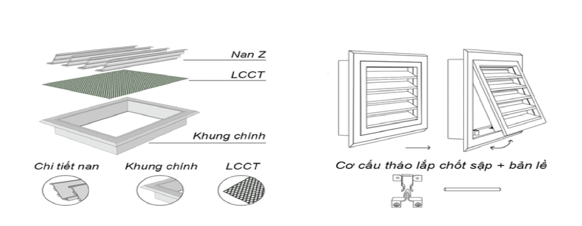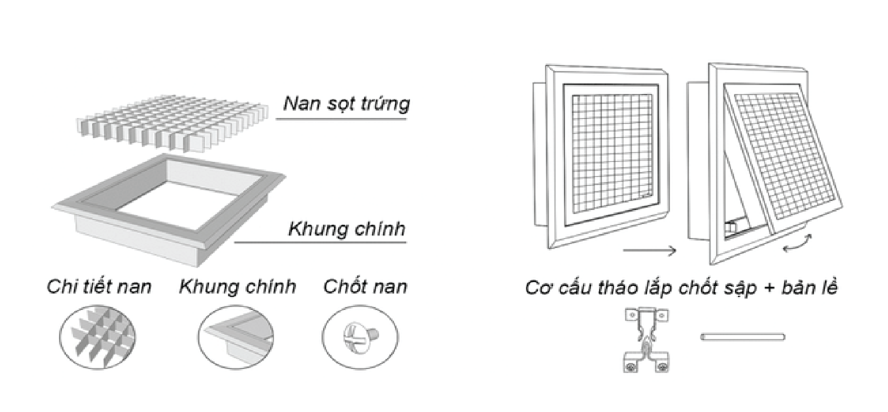 Cửa có khung và lõi tách riêng biệt, giúp dễ dàng tháo lắp và bảo trì. Cửa gió này bao gồm hai loại chính: cửa gió hai khung nan bầu dục và cửa gió hai khung nan T.
